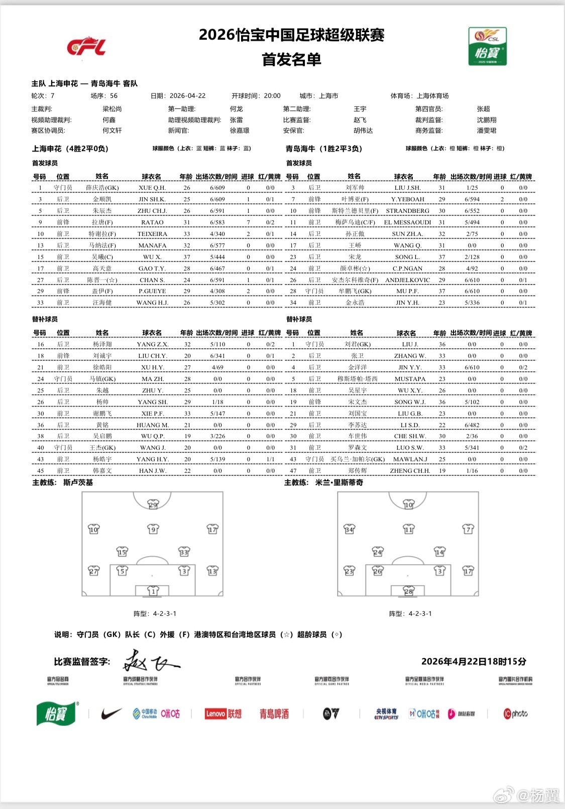 04月22日讯 北京时间今晚20点,中超联赛第7轮,上海申花主场迎战青岛海牛,赛前双方公布首发阵容。